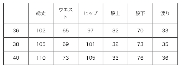 以下尺寸依序為:總長/腰圍/臀圍/褲襠/襠下長/大腿圍